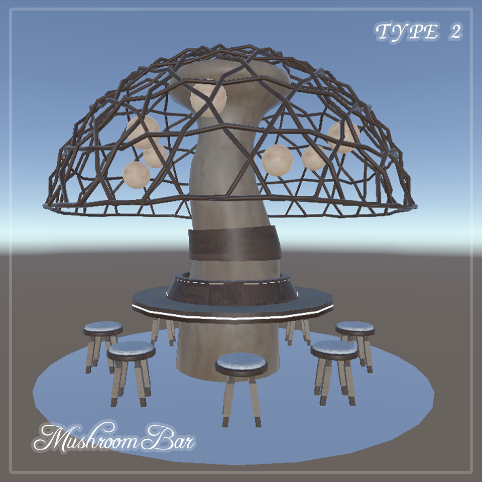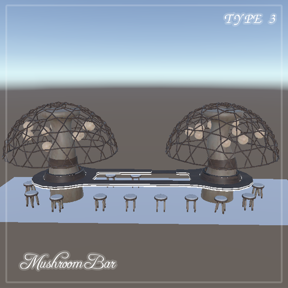 ❖ The Mushroom Bar is a 3D prop available in three styles: a bar with shelves, a bar without shelves, and a seating table.